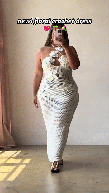 The a captivating piece that exudes femininity and grace. The functional halter design adds a touch of allure and allows for customisable styling, while the delicate crochet flower appliqué enhances the dress with a romantic and whimsical feel.