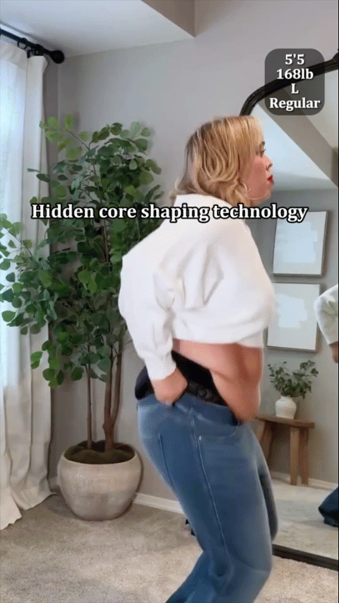 The hidden core shaping panel tech with pull-on design will shape and support your curves while providing a smoother fit in front. Also expertly designed with roomy wide-leg silhouette, the jeans provide a comfortable and flattering fit, build a curvier backside with ease in the hip and thigh.